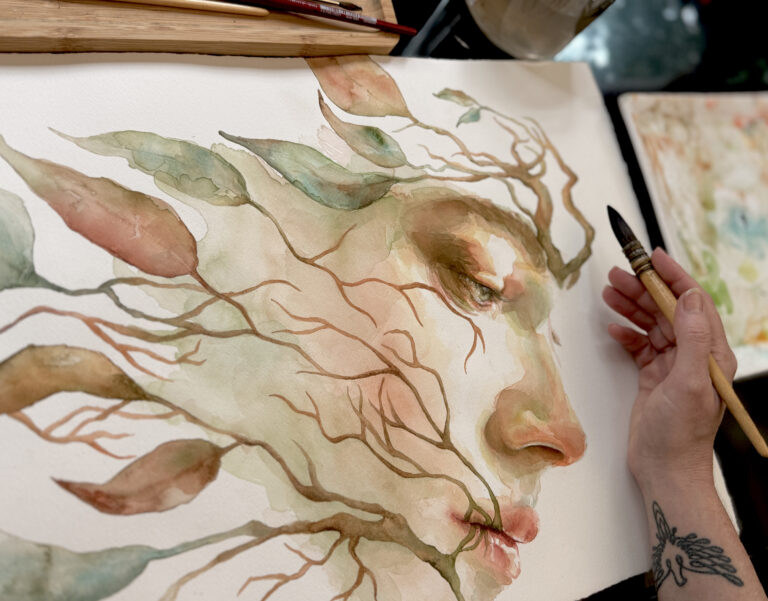 Em presença, o silêncio torna-se um território habitável onde flui uma dança entre água e cor. Ali, essa linguagem cria raízes e brota em forma de aquarela.