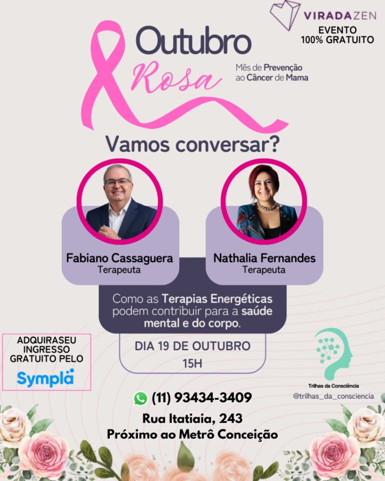 Nesta palestra os Terapeutas Fabiano Cassaguerra e Nathalia Fernandes vão falar sobre como as terapias energéticas podem contribuir para a saúde mental e do corpo.