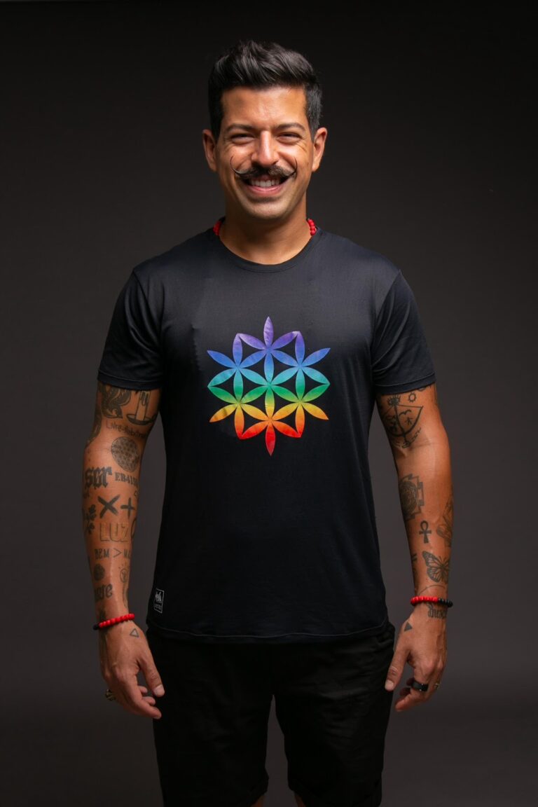 desenvolvendo um estilo vibrante inspirado na espiritualidade e nas cores do arco-íris.