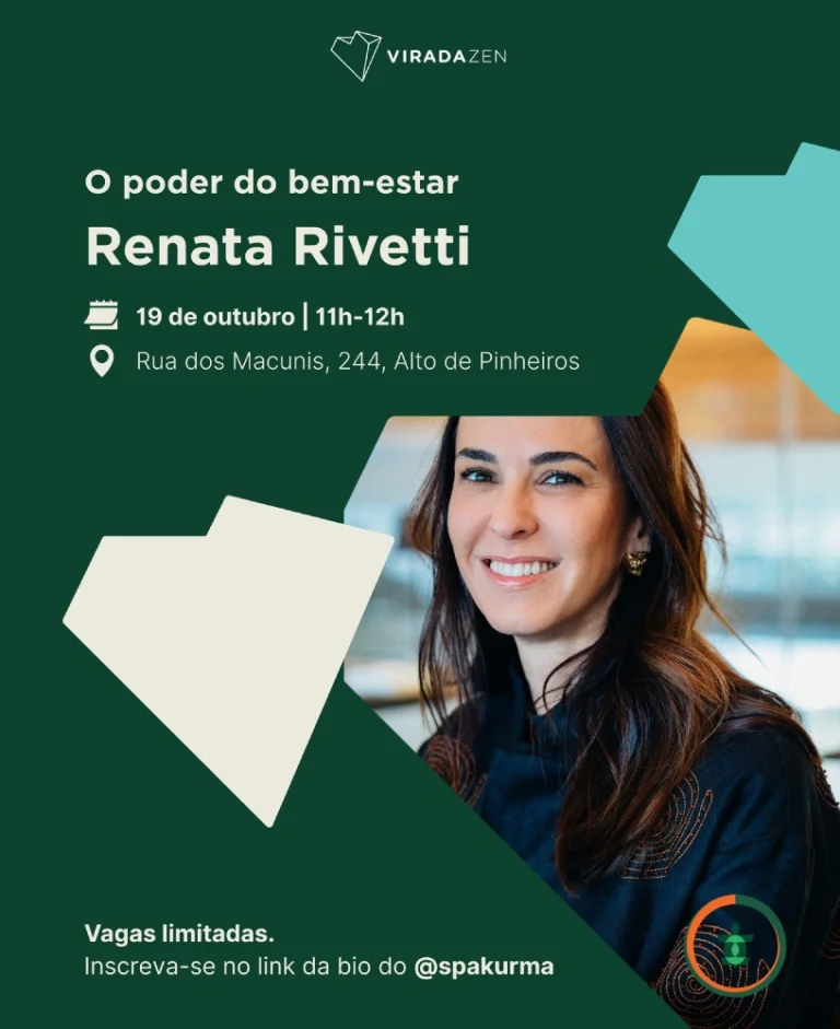No dia 19/10 das 11h às 12h no Kurma Spa, temos um encontro marcado com Renata Rivetti, que é especialista na ciência da felicidade, TEDx speaker, LinkedIn Top Voice, colunista e autora do “O Poder do bem-estar: um guia para redesenhar o futuro do trabalho” pelo selo Objetiva da Companhia das Letras. Após anos como executiva de marketing, fez uma transição de carreira e hoje é referência nos temas felicidade, relações humanas, liderança humanizada, saúde mental e futuro do trabalho.