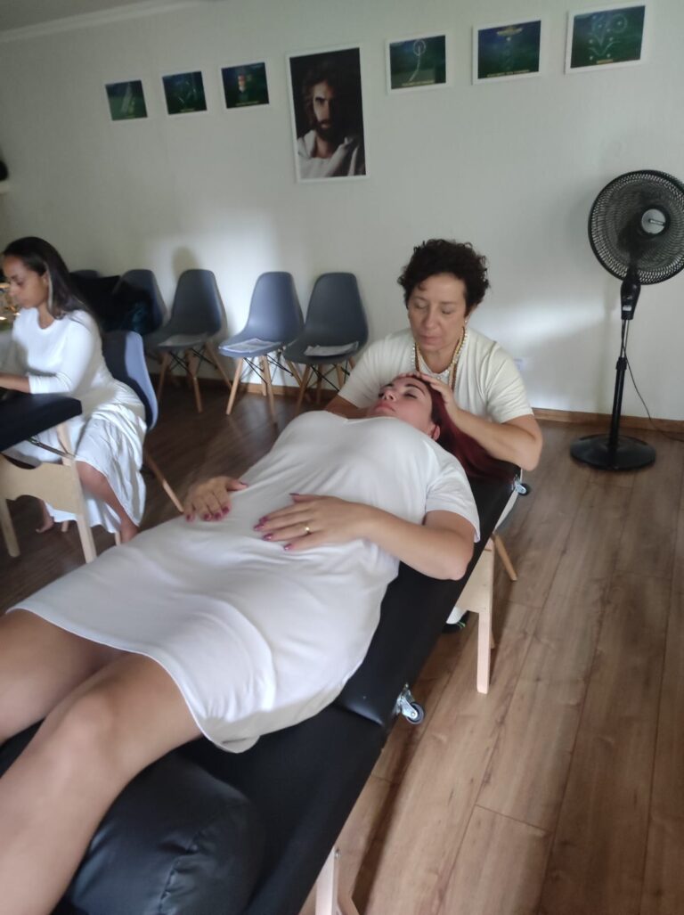 Método: Imposição das mãos em pontos energéticos do corpo (chakras principais).